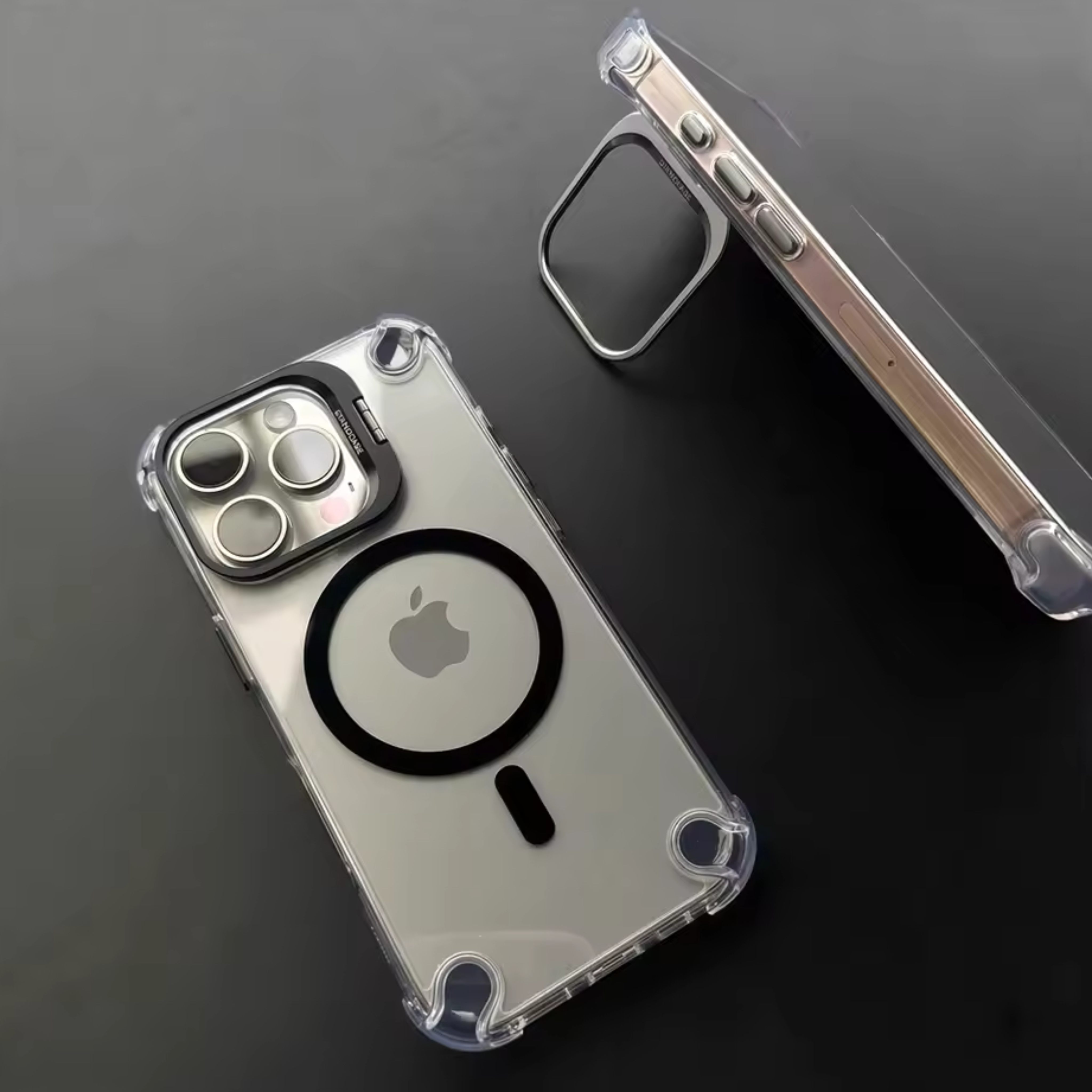 Alloy Lens Stand Anti-fall Clear Magnetic Phone Case For iPhone. Corner Anti-fall Shockproof Cover for Wireless Charge supported..