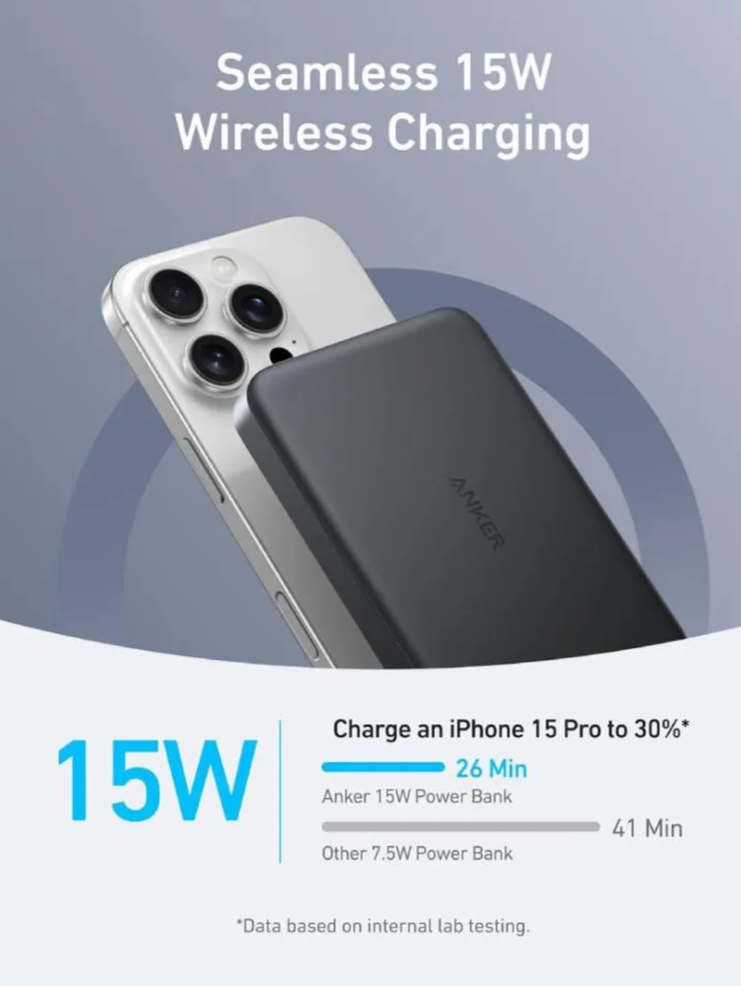 Ultra-Fast 15W Wireless Charging: Keep your devices fully charged wherever you go with 15W Qi2-certified wireless output, which charges an iPhone 15 Pro from 0 to 50% in 51 minutes. It also features a 30W USB-C port for extensive compatibility.