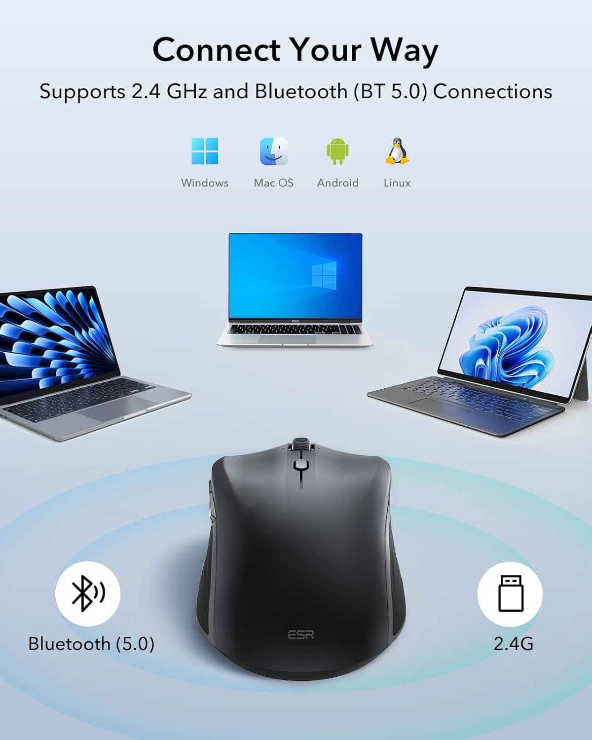 No need for cables or disposable batteries. The built-in USB-C fast charging cable provides 4 hours of use with just 1 minute of charging and up to 160 hours with a full 45-minute charge. Dual connection modes include 2.4 GHz wireless dongle and Bluetooth 5.0, ensuring compatibility with most PCs and laptops.
