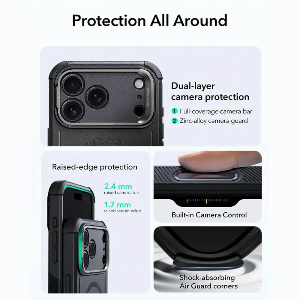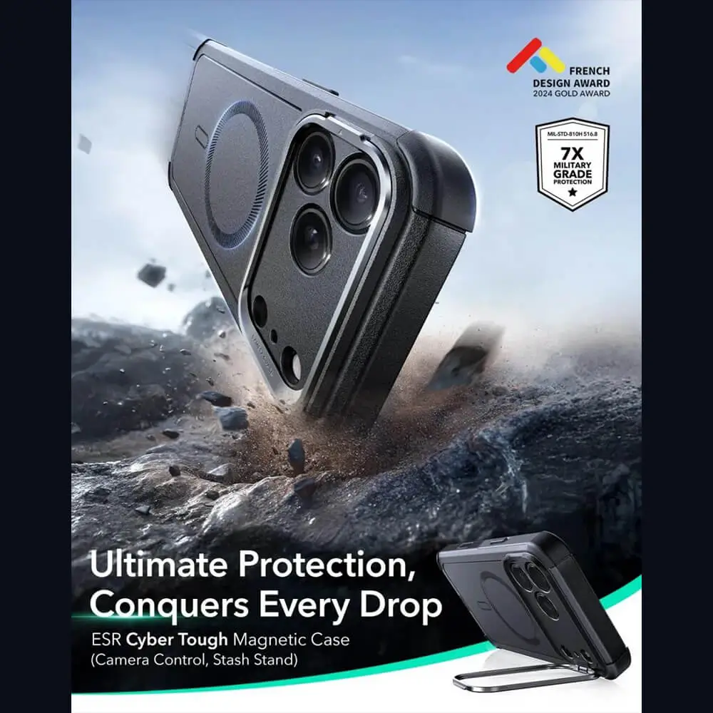 The ESR Cyber Tough Magnetic Case combines rugged protection with a slim, stylish design for iPhone 17 Pro Max, 17 Pro, 17, and iPhone Air. With military-grade durability, strong magnetic lock, and scratch resistance, it keeps your phone safe while supporting MagSafe and wireless charging.